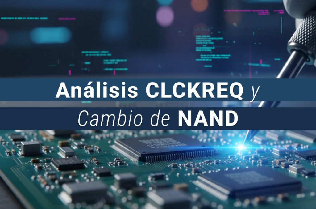 El diagnóstico y la reparación avanzada de placas lógicas en equipos Apple requieren un conocimiento profundo de las líneas de control del sistema y de la arquitectura de almacenamiento basada en memoria NAND. En numerosos casos de equipos que no completan la secuencia de arranque, presentan carpeta con signo de interrogación o simplemente no reconocen el almacenamiento interno, dos elementos del sistema adquieren especial relevancia durante el proceso de diagnóstico: la señal CLCKREQ (Clock Request) y la integridad del subsistema NAND.
